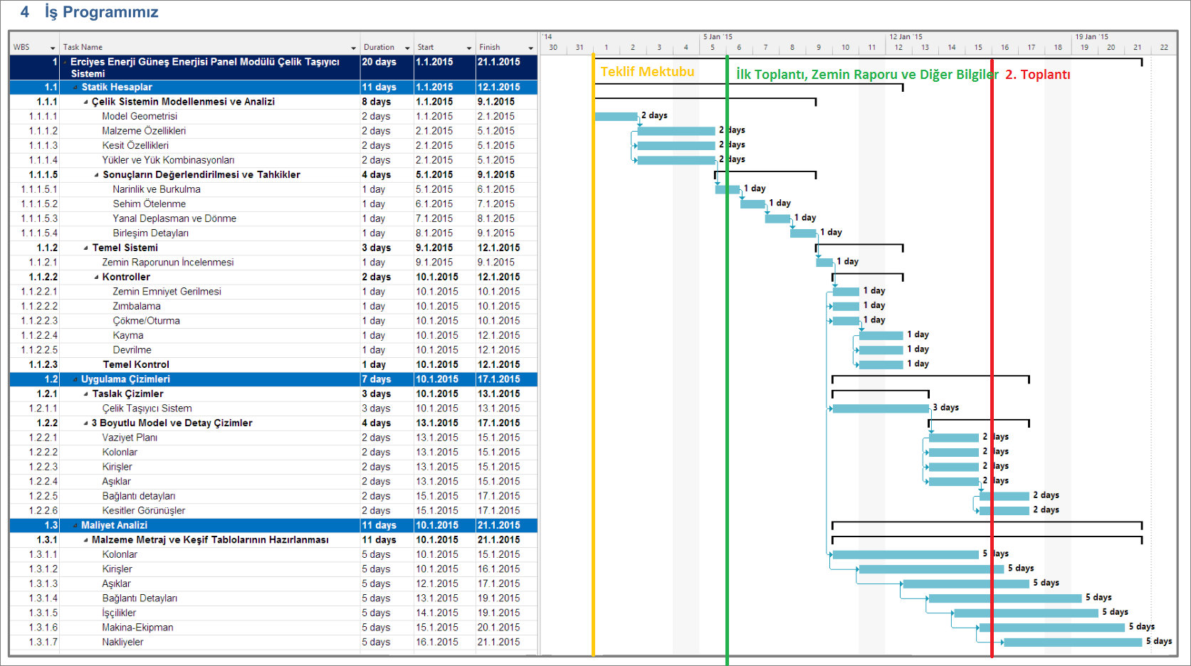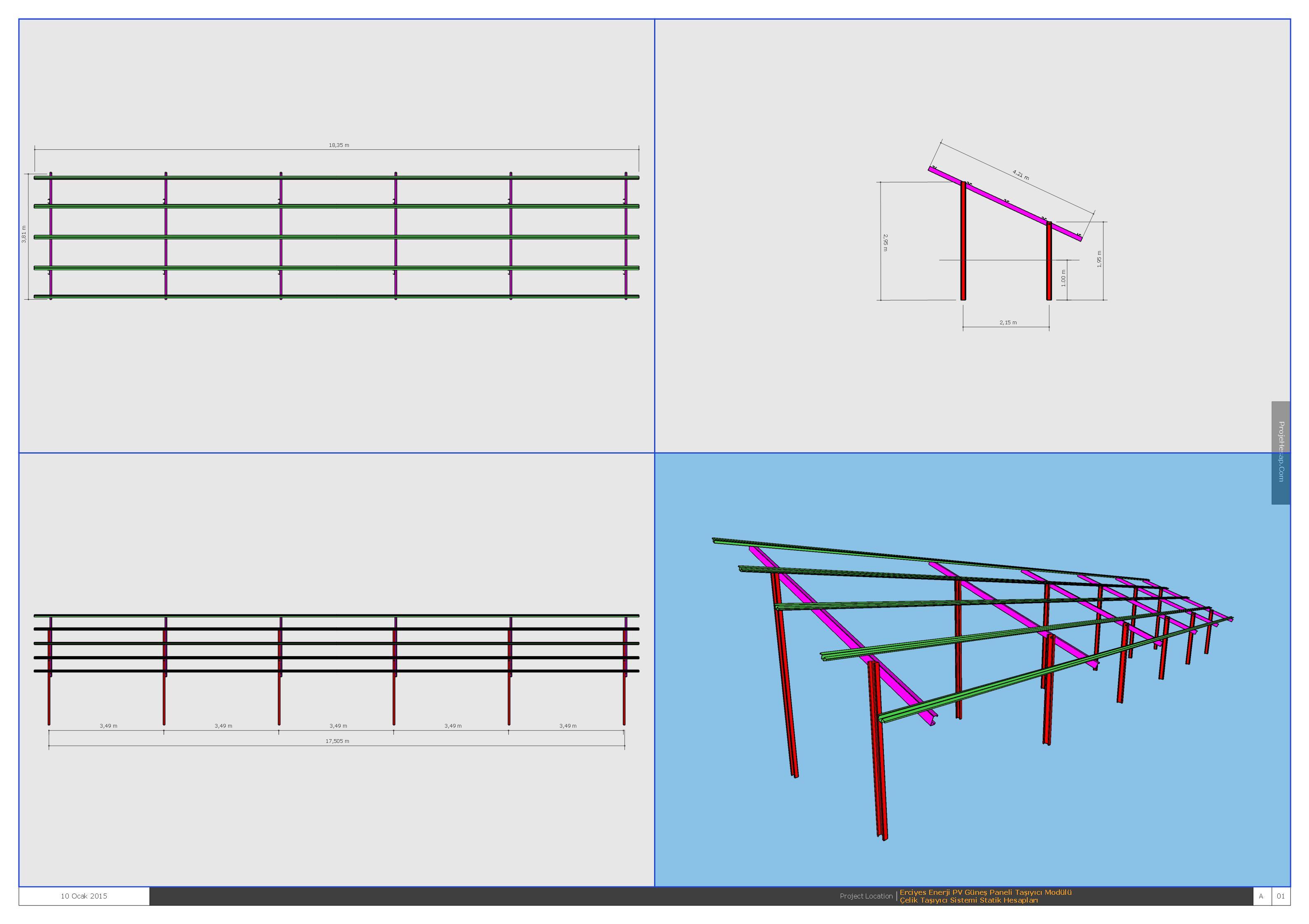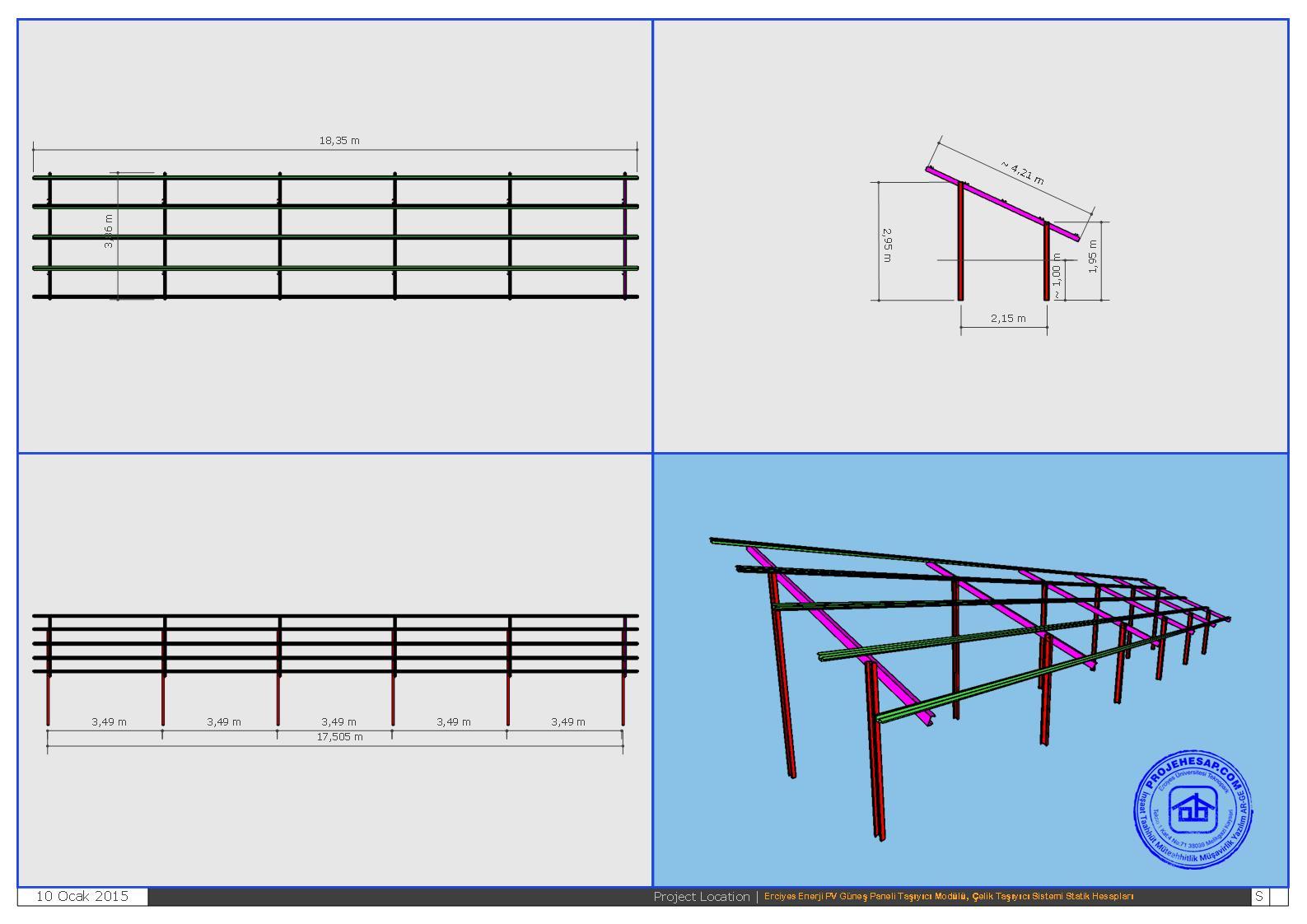 Kayseri İli, Bünyan İlçesin’de ve Anadolu’nun çeşitli yerlerinde yapılacak olan Güneş Enerji Santralleri’ne ait Solar Panel Taşıyıcı Modülleri bilgisayarda modellenerek uygulamanın yapılacağı coğrafi konumdaki etkin kar, rüzgar, zemin vb değişkenler göz önünde bulundurularak şartnamelere uygun taşıyıcı sistemler tasarlanarak kesit ve boyut optimizasyon çalışmaları yapılmış, tasarlanan Taşıyıcı Modüller’e ait hesaplar ve çizimler tamamlanmıştır.