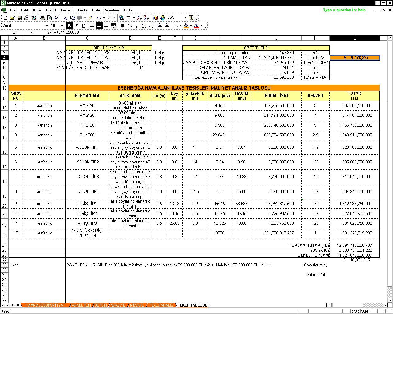 Esenboğa Hava Limanı yolcu binası yapımı için prefabrik betonarme elemanlar ile teşkil edilen taşıyıcı sisteme ait metraj ve keşif tabloları hazırlanmıştır.