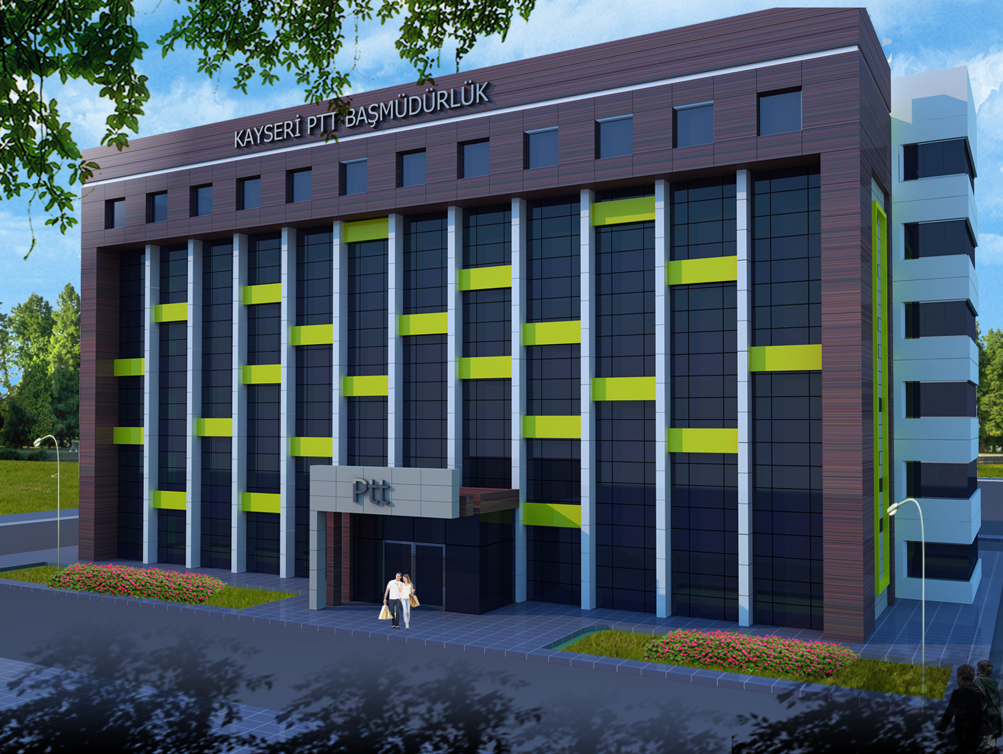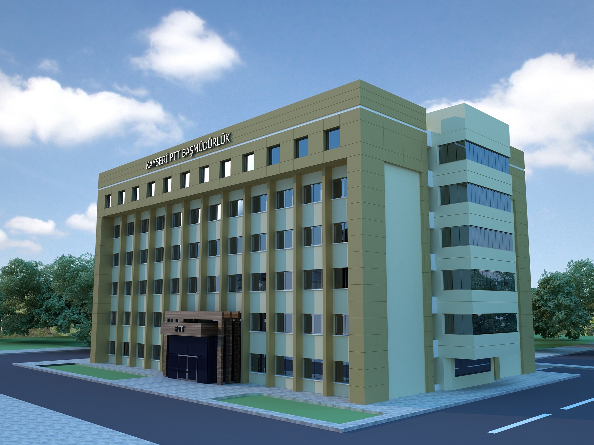Kayseri PTT Başmüdürlüğüne ait binanın, Dış Cephe ve İç mekan Tasarımları yapılmış. Tasarıma ait görselleştirmeler hazırlanmıştır.
